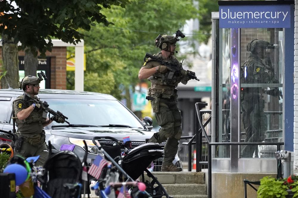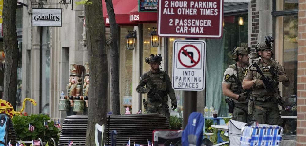 Law enforcement search after a mass shooting at the Highland Park Fourth of July parade in downtown Highland Park, Ill., a Chicago suburb on Monday, July 4, 2022. (AP Photo/Nam Y. Huh)