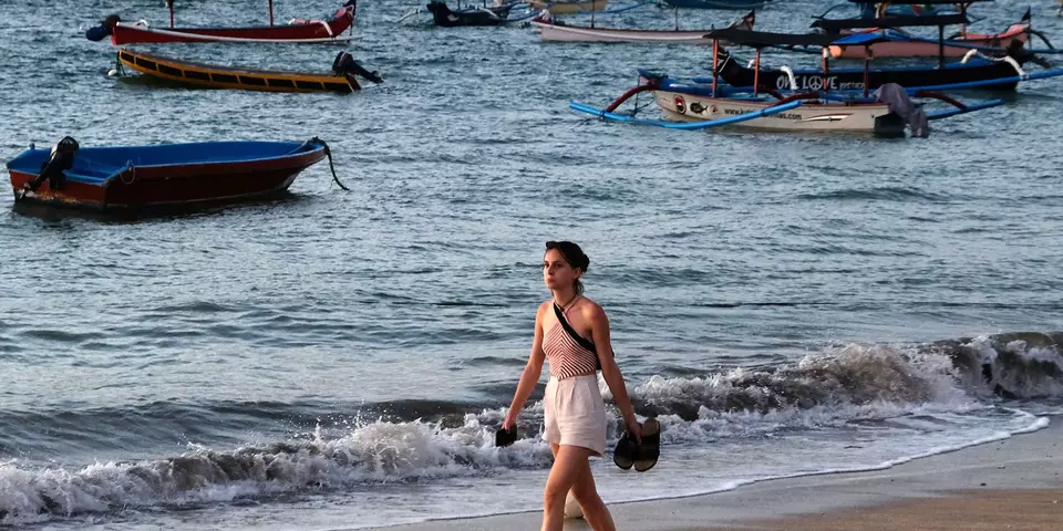 A foreign tourist walks alongside a beach in Bali on May 6, 2024. (Antara Photo)