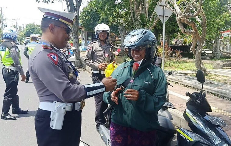 In celebration of Valentine’s Day, the Traffic Unit of Bangli District Police distributed flowers and chocolates to road users passing on Jalan Brigjen Ngurah Rai on Friday. Officers also informed motorists to always be orderly and obey traffic laws.
